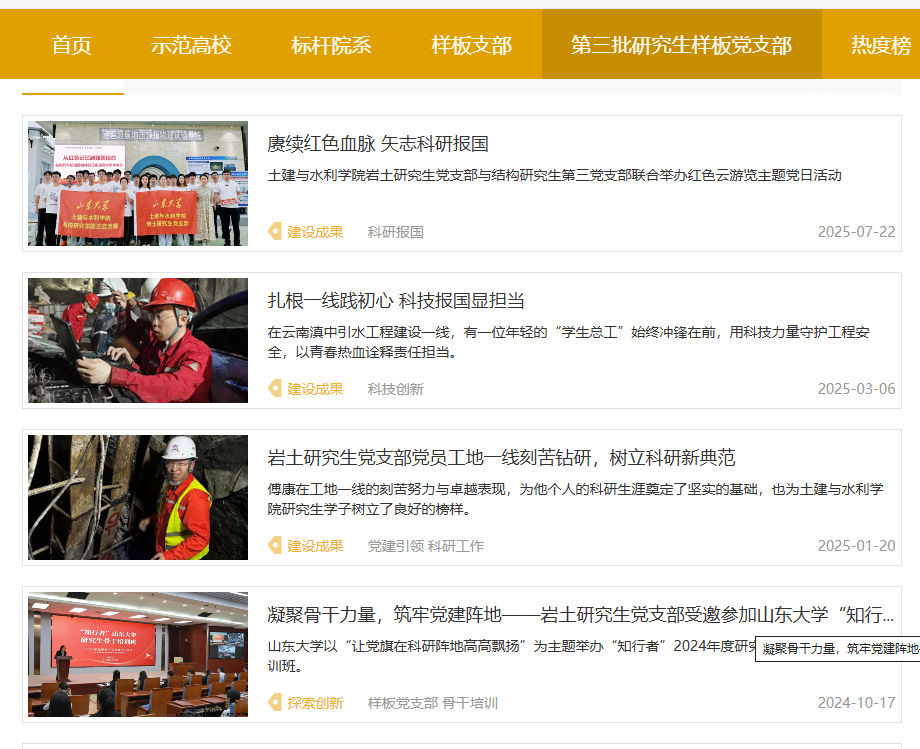支部充分利用微信公众号、门户网站等平台宣传党建成果。升级我院研究生微信公众号栏目设置,开设“样板支部”特色专栏,定期推送支部动态、典型案例,展示党员在重大工程中的工作场景。依托全国高校思想政治工作网、山东大学新闻网等权威平台,发布深度报道。开展“红色云游览”等线上直播,通过“山大研究生”视频号直播隧道工程灾变防控与智能建养实验室,由党员现场讲解技术难点,线上互动超300人次,实现党建与科研的“破圈”传播。支部还参与新时代高校党建论坛,在“一融双高”工作论坛上作经验报告,推广党建创新做法。通过多渠道宣传,支部展示了党员风采、科研进展和社会实践,提升了党建品牌影响力。
