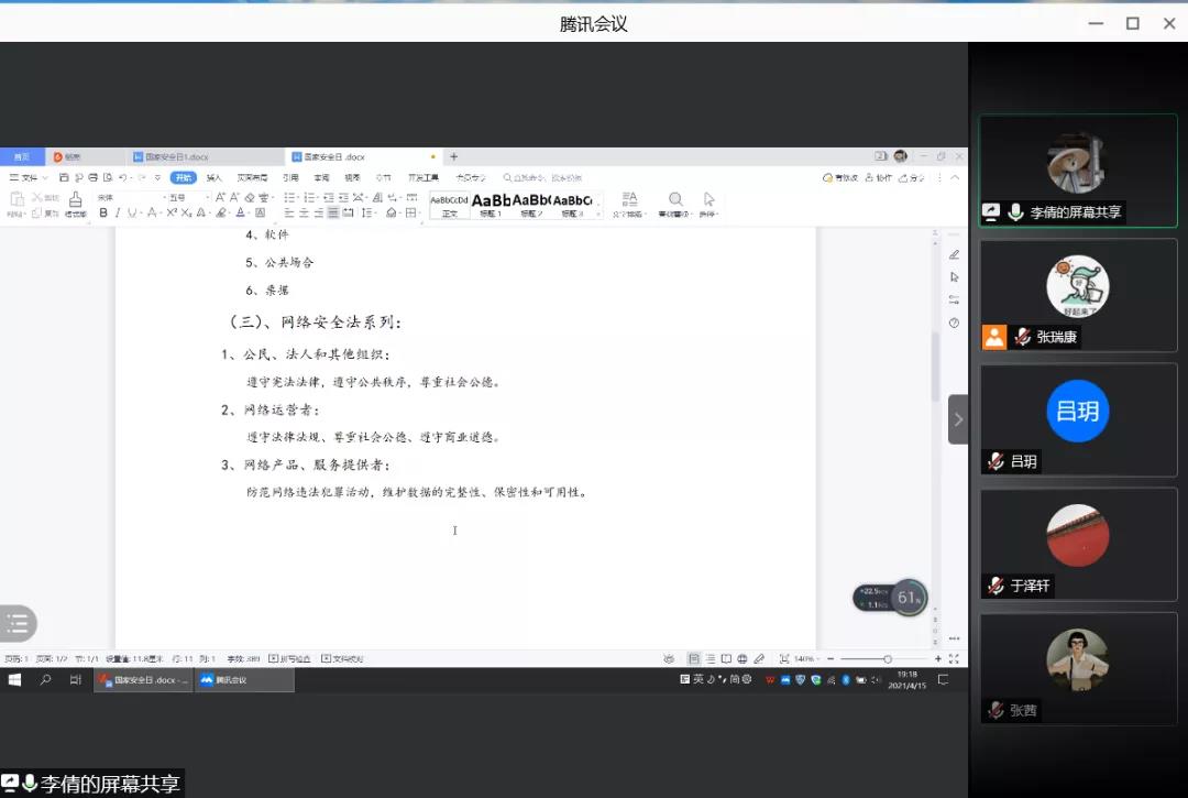 为提高同学们的国家安全意识,深入学习贯彻习近平总书记提出的“总体国家安全观”,4月15日晚,山东大学土建与水利学院本科生第一党支部土木党小组于线上开展“国家安全记心间”主题会议。会议由张瑞康同志主持,全体党员、预备党员参加。