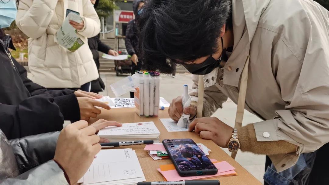 上午11时,活动准时开始,负责宣传的团小组前往欣园西门南侧和欣园西门西侧,向路过的同学们发放明信片,并宣传本次活动,引导他们参与到活动当中。负责看守展台的团小组向参加明信片书写的同学提供空白明信片和笔,并邀请参加活动的同学扫码关注班级公众号。负责机动的团小组则视情况行动,为工作较为繁忙的小组提供辅助。负责记录的同学用相机定格下了本次活动中的一个个精彩瞬间,并用延时摄影记录下活动的全过程。各团小组之间分工明确,合作紧密。虽然活动期间气温较低,但2020级土水海三班的同学们用自己真诚的付出,向同学们传递出了冬日中的温暖。