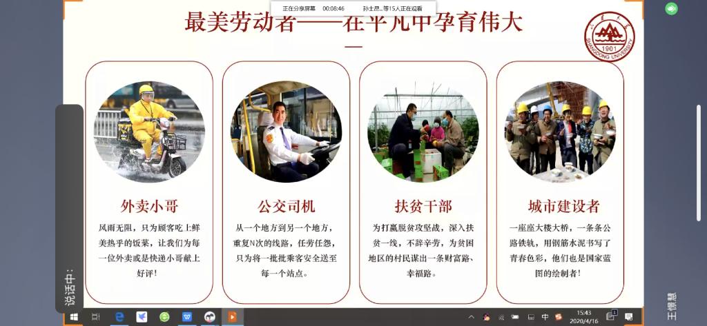4月16日下午,山东大学土建与水利学院2017级土木一班团支部开展“向最美劳动者致敬”线上主题团日活动,活动由团支书王憬慧和组宣委员吕玥组织,支部全体同学参加。